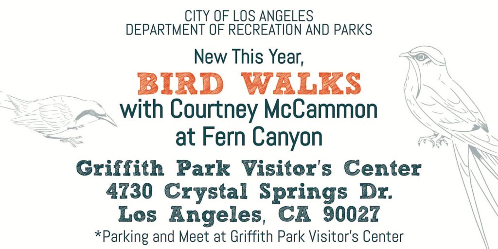 Come with us on a Weekday Bird Walks with Courney McCammon! Let us explore our neighborhood and identify our avian friends on January 18th, February 22nd, March 20th, and April 24th. Gathering starts at 8:00 in the morning at the Griffith Park Visitor’s Center. All ages are welcome! Bring your water, wear your hiking hat and shoes, and protect your skin with sunscreen!