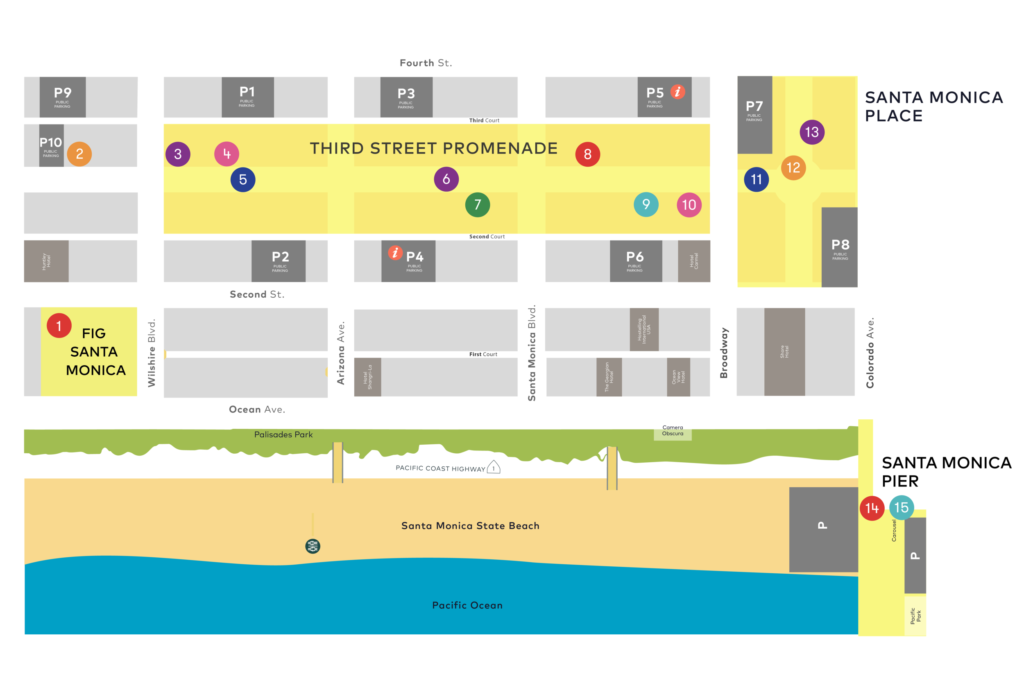 Spanning Third Street Promenade, through Santa Monica Place, and leading through the Santa Monica Pier, strollers can appreciate 13 incredible one-of-a-kind art installations by LGBTQIA+ artists. Please use the map below to enjoy these beautiful creations at your leisure.
